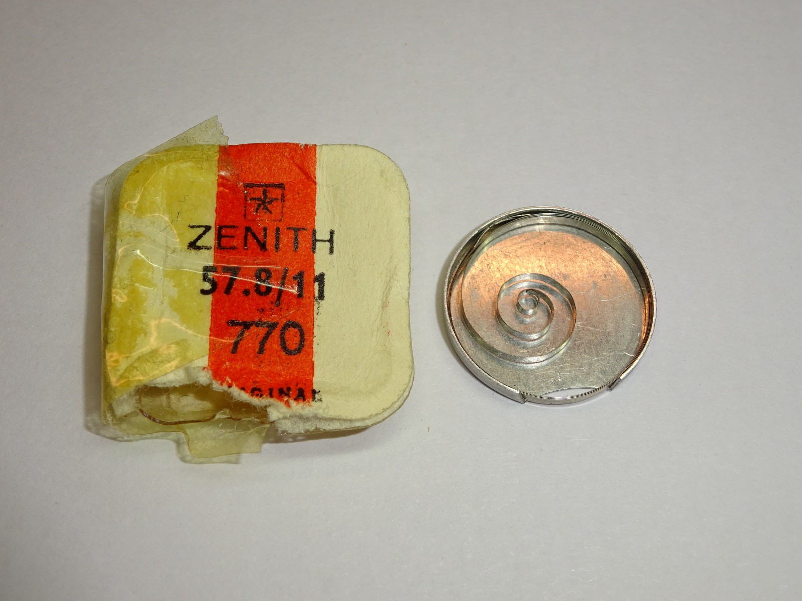 Zenith 11 11T 57 57/8 inox mainspring / Ressort de barillet / Zugfeder Bride Ă ailettes / double brace Neuf de stock / New old stock Le prix est pour 1 ressort / The price is for 1 mainspring